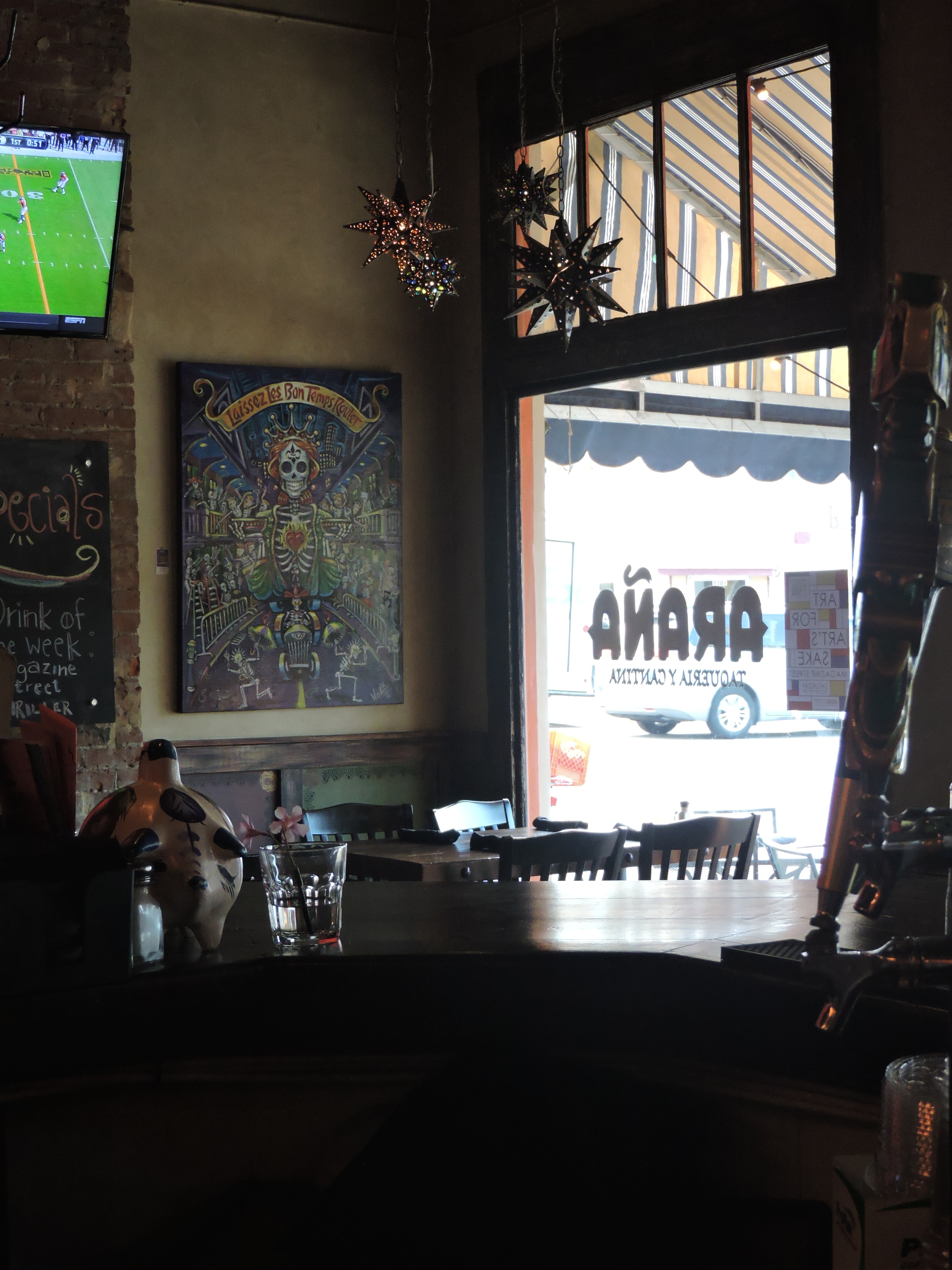 Nestled amongst many beautiful restaurants and bars on Magazine Street, we were drawn in by the chalkboard sign outside that advertised half price tacos and all drinks. Once inside, we immediately shuttered at the loud salsa music, but stayed for the decor and intoxicating smells of Mexican food. The giant spider with the Day of the Dead mask on the wall certainly added to the authenticity. Tin star lights hanging from the ceiling set a dark, yet comfortable tone.